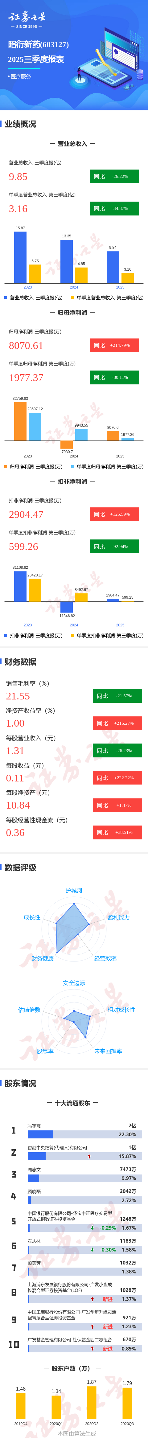 证券之星消息,昭衍新药2025年三季报显示,前三季度公司主营收入9.85亿元,同比下降26.23%;归母净利润8070.61万元,同比上升214.79%;扣非净利润2904.47万元,同比上升125.6%;其中2025年第三季度,公司单季度主营收入3.16亿元,同比下降34.87%;单季度归母净利润1977.37万元,同比下降80.11%;单季度扣非净利润599.26万元,同比下降92.94%;负债率14.81%,投资收益2003.33万元,财务费用-5291.34万元,毛利率21.55%。
