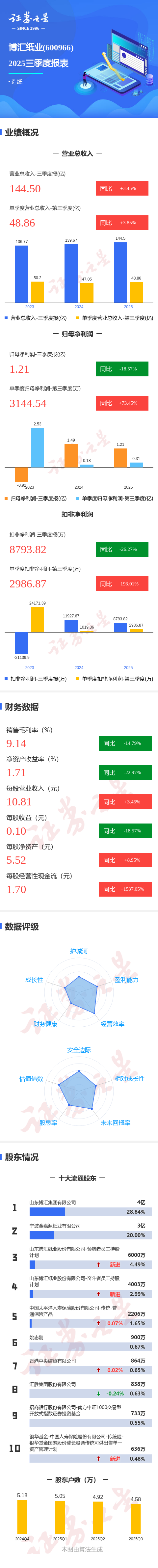 证券之星消息,博汇纸业2025年三季报显示,前三季度公司主营收入144.5亿元,同比上升3.46%;归母净利润1.21亿元,同比下降18.57%;扣非净利润8793.82万元,同比下降26.27%;其中2025年第三季度,公司单季度主营收入48.86亿元,同比上升3.86%;单季度归母净利润3144.54万元,同比上升73.45%;单季度扣非净利润2986.87万元,同比上升193.01%;负债率68.97%,投资收益-2191.25万元,财务费用2.92亿元,毛利率9.14%。