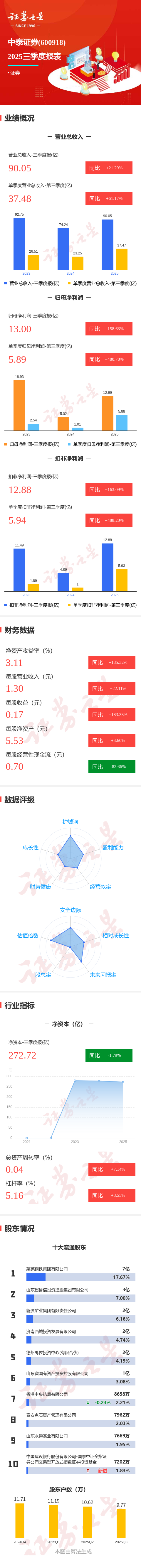 证券之星消息,中泰证券2025年三季报显示,前三季度公司主营收入90.05亿元,同比上升21.3%;归母净利润13.0亿元,同比上升158.63%;扣非净利润12.88亿元,同比上升163.1%;其中2025年第三季度,公司单季度主营收入37.48亿元,同比上升61.18%;单季度归母净利润5.89亿元,同比上升480.78%;单季度扣非净利润5.94亿元,同比上升488.2%;负债率80.63%,投资收益23.05亿元。