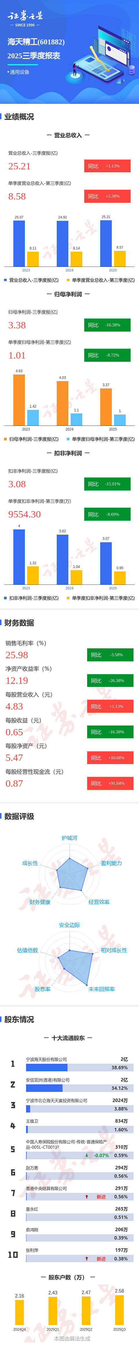 证券之星消息,海天精工2025年三季报显示,前三季度公司主营收入25.21亿元,同比上升1.13%;归母净利润3.38亿元,同比下降16.39%;扣非净利润3.08亿元,同比下降15.01%;其中2025年第三季度,公司单季度主营收入8.58亿元,同比上升5.38%;单季度归母净利润1.01亿元,同比下降8.73%;单季度扣非净利润9554.3万元,同比下降8.7%;负债率44.53%,投资收益241.59万元,财务费用-832.48万元,毛利率25.98%。