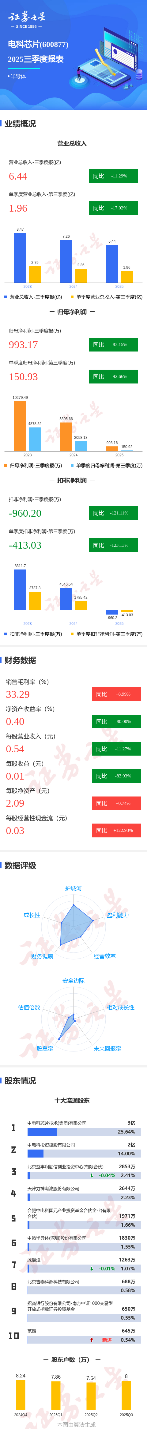 证券之星消息,电科芯片2025年三季报显示,前三季度公司主营收入6.44亿元,同比下降11.3%;归母净利润993.17万元,同比下降83.15%;扣非净利润-960.2万元,同比下降121.12%;其中2025年第三季度,公司单季度主营收入1.96亿元,同比下降17.02%;单季度归母净利润150.93万元,同比下降92.67%;单季度扣非净利润-413.03万元,同比下降123.13%;负债率16.44%,财务费用-92.89万元,毛利率33.29%。