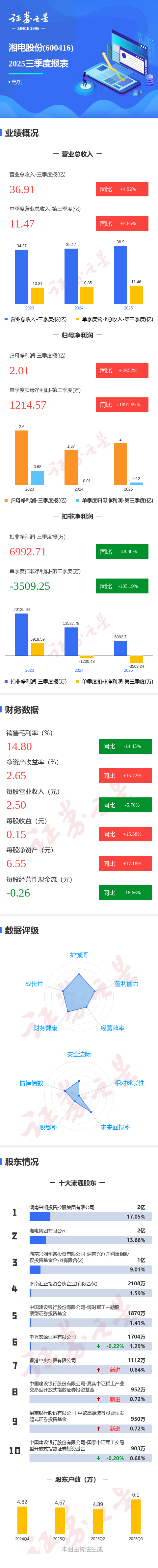 证券之星消息,湘电股份2025年三季报显示,前三季度公司主营收入36.91亿元,同比上升4.92%;归母净利润2.01亿元,同比上升19.53%;扣非净利润6992.71万元,同比下降48.31%;其中2025年第三季度,公司单季度主营收入11.47亿元,同比上升5.66%;单季度归母净利润1214.57万元,同比上升1091.69%;单季度扣非净利润-3509.25万元,同比下降185.19%;负债率44.17%,投资收益1667.35万元,财务费用2839.18万元,毛利率14.8%。