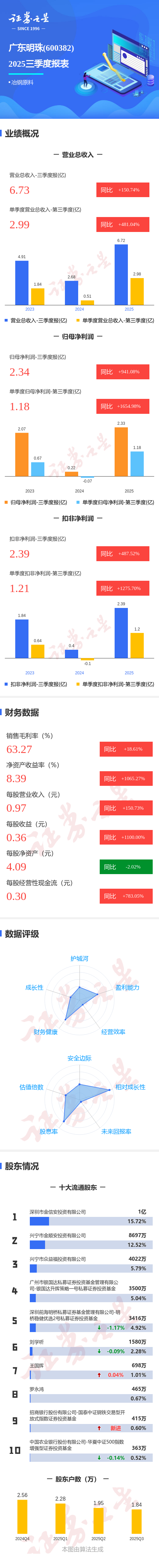 证券之星消息,广东明珠2025年三季报显示,前三季度公司主营收入6.73亿元,同比上升150.74%;归母净利润2.34亿元,同比上升941.09%;扣非净利润2.39亿元,同比上升487.53%;其中2025年第三季度,公司单季度主营收入2.99亿元,同比上升481.05%;单季度归母净利润1.18亿元,同比上升1654.98%;单季度扣非净利润1.21亿元,同比上升1275.71%;负债率16.17%,投资收益133.7万元,财务费用640.45万元,毛利率63.27%。