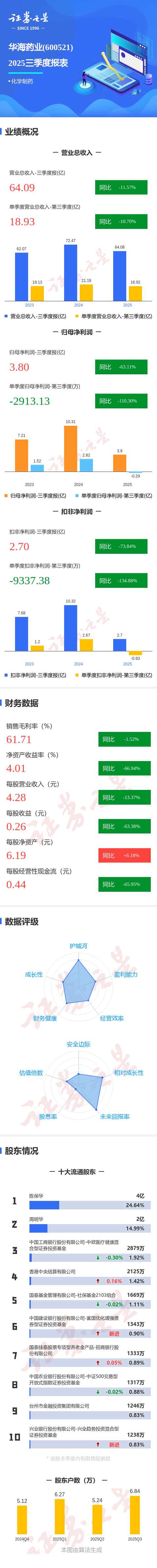 证券之星消息,华海药业2025年三季报显示,前三季度公司主营收入64.09亿元,同比下降11.57%;归母净利润3.8亿元,同比下降63.12%;扣非净利润2.7亿元,同比下降73.85%;其中2025年第三季度,公司单季度主营收入18.93亿元,同比下降10.7%;单季度归母净利润-2913.13万元,同比下降110.3%;单季度扣非净利润-9337.38万元,同比下降134.88%;负债率54.62%,投资收益1734.29万元,财务费用1.68亿元,毛利率61.71%。