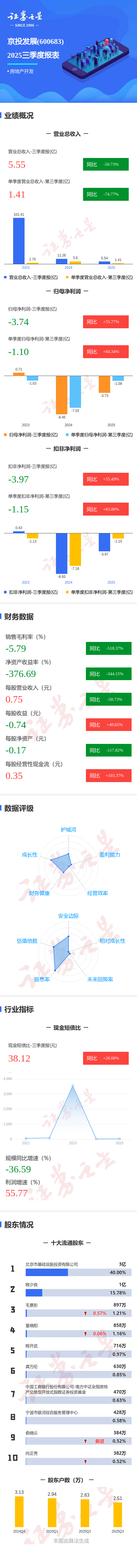 证券之星消息,京投发展2025年三季报显示,前三季度公司主营收入5.55亿元,同比下降50.74%;归母净利润-3.74亿元,同比上升55.77%;扣非净利润-3.97亿元,同比上升55.5%;其中2025年第三季度,公司单季度主营收入1.41亿元,同比下降74.78%;单季度归母净利润-1.1亿元,同比上升84.35%;单季度扣非净利润-1.15亿元,同比上升83.89%;负债率91.13%,投资收益-3896.84万元,财务费用2.83亿元,毛利率-5.79%。