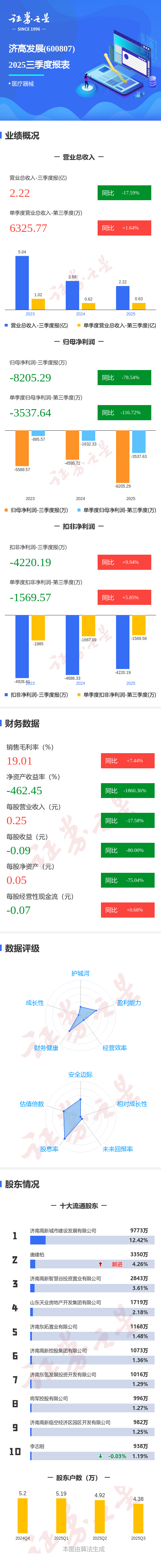 证券之星消息,济高发展2025年三季报显示,前三季度公司主营收入2.22亿元,同比下降17.59%;归母净利润-8205.29万元,同比下降78.54%;扣非净利润-4220.19万元,同比上升9.95%;其中2025年第三季度,公司单季度主营收入6325.77万元,同比上升1.64%;单季度归母净利润-3537.64万元,同比下降116.72%;单季度扣非净利润-1569.57万元,同比上升5.85%;负债率87.1%,投资收益-364.77万元,财务费用1692.82万元,毛利率19.01%。