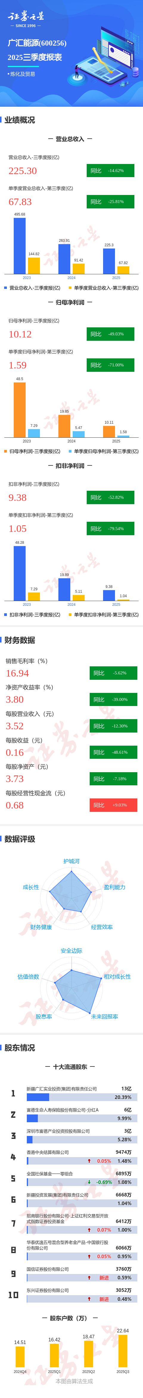 证券之星消息,广汇能源2025年三季报显示,前三季度公司主营收入225.3亿元,同比下降14.63%;归母净利润10.12亿元,同比下降49.03%;扣非净利润9.38亿元,同比下降52.83%;其中2025年第三季度,公司单季度主营收入67.83亿元,同比下降25.81%;单季度归母净利润1.59亿元,同比下降71.01%;单季度扣非净利润1.05亿元,同比下降79.55%;负债率56.78%,投资收益6819.89万元,财务费用6.06亿元,毛利率16.94%。