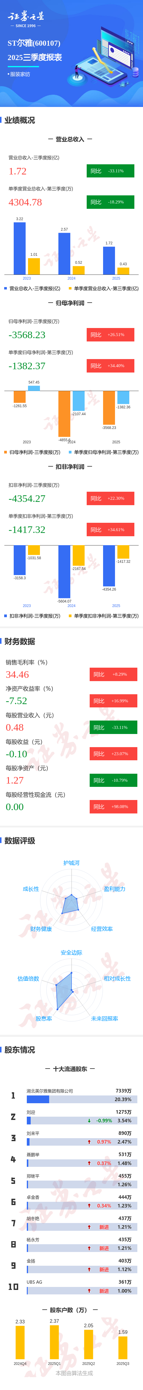 证券之星消息,ST尔雅2025年三季报显示,前三季度公司主营收入1.72亿元,同比下降33.12%;归母净利润-3568.23万元,同比上升26.51%;扣非净利润-4354.27万元,同比上升22.3%;其中2025年第三季度,公司单季度主营收入4304.78万元,同比下降18.29%;单季度归母净利润-1382.37万元,同比上升34.41%;单季度扣非净利润-1417.32万元,同比上升34.61%;负债率37.4%,投资收益516.78万元,财务费用286.66万元,毛利率34.46%。