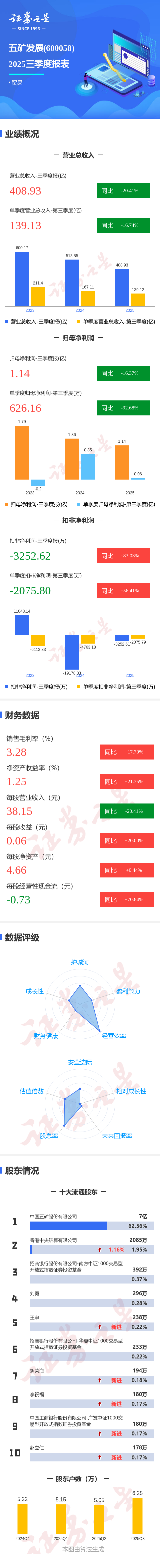 证券之星消息,五矿发展2025年三季报显示,前三季度公司主营收入408.93亿元,同比下降20.42%;归母净利润1.14亿元,同比下降16.37%;扣非净利润-3252.62万元,同比上升83.04%;其中2025年第三季度,公司单季度主营收入139.13亿元,同比下降16.75%;单季度归母净利润626.16万元,同比下降92.68%;单季度扣非净利润-2075.8万元,同比上升56.42%;负债率70.63%,投资收益-1.76亿元,财务费用1.05亿元,毛利率3.28%。