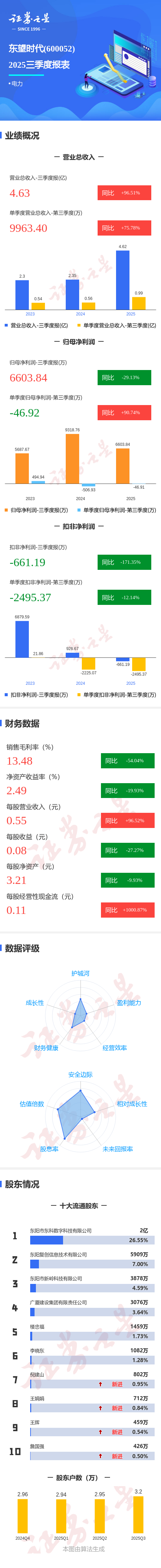 证券之星消息,东望时代2025年三季报显示,前三季度公司主营收入4.63亿元,同比上升96.51%;归母净利润6603.84万元,同比下降29.13%;扣非净利润-661.19万元,同比下降171.35%;其中2025年第三季度,公司单季度主营收入9963.4万元,同比上升75.79%;单季度归母净利润-46.92万元,同比上升90.74%;单季度扣非净利润-2495.37万元,同比下降12.15%;负债率8.85%,投资收益5486.37万元,财务费用-615.65万元,毛利率13.48%。