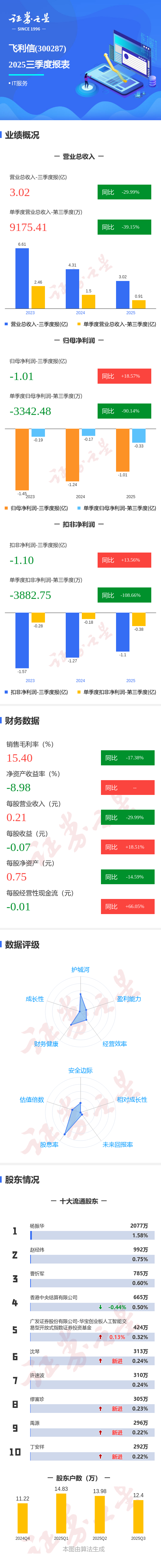 证券之星消息,飞利信2025年三季报显示,前三季度公司主营收入3.02亿元,同比下降30.0%;归母净利润-1.01亿元,同比上升18.57%;扣非净利润-1.1亿元,同比上升13.56%;其中2025年第三季度,公司单季度主营收入9175.41万元,同比下降39.15%;单季度归母净利润-3342.48万元,同比下降90.15%;单季度扣非净利润-3882.75万元,同比下降108.66%;负债率49.52%,投资收益-303.18万元,财务费用-73.97万元,毛利率15.4%。