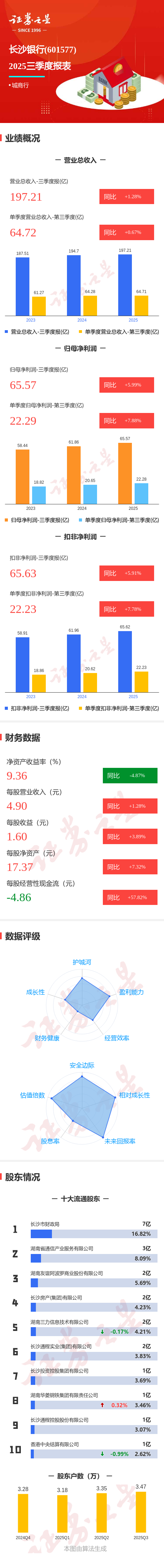 证券之星消息,长沙银行2025年三季报显示,前三季度公司主营收入197.21亿元,同比上升1.29%;归母净利润65.57亿元,同比上升6.0%;扣非净利润65.63亿元,同比上升5.91%;其中2025年第三季度,公司单季度主营收入64.72亿元,同比上升0.68%;单季度归母净利润22.29亿元,同比上升7.88%;单季度扣非净利润22.23亿元,同比上升7.78%;负债率93.31%,投资收益54.64亿元。