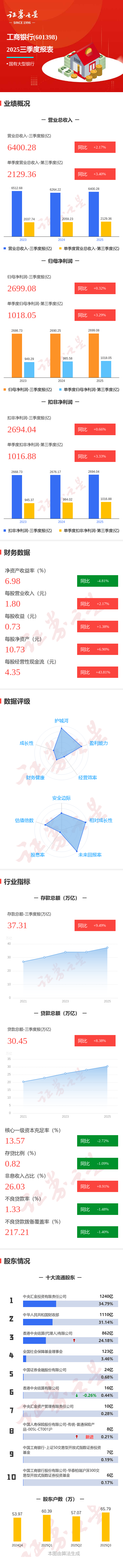 证券之星消息,工商银行2025年三季报显示,前三季度公司主营收入6400.28亿元,同比上升2.17%;归母净利润2699.08亿元,同比上升0.33%;扣非净利润2694.04亿元,同比上升0.67%;其中2025年第三季度,公司单季度主营收入2129.36亿元,同比上升3.41%;单季度归母净利润1018.05亿元,同比上升3.29%;单季度扣非净利润1016.88亿元,同比上升3.34%;负债率92.06%,投资收益486.15亿元。
