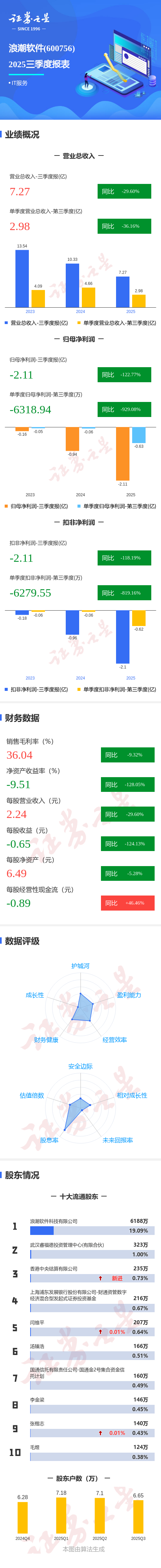 证券之星消息,浪潮软件2025年三季报显示,前三季度公司主营收入7.27亿元,同比下降29.61%;归母净利润-2.11亿元,同比下降122.78%;扣非净利润-2.11亿元,同比下降118.2%;其中2025年第三季度,公司单季度主营收入2.98亿元,同比下降36.16%;单季度归母净利润-6318.94万元,同比下降929.09%;单季度扣非净利润-6279.55万元,同比下降819.16%;负债率49.03%,投资收益861.42万元,财务费用-314.93万元,毛利率36.04%。