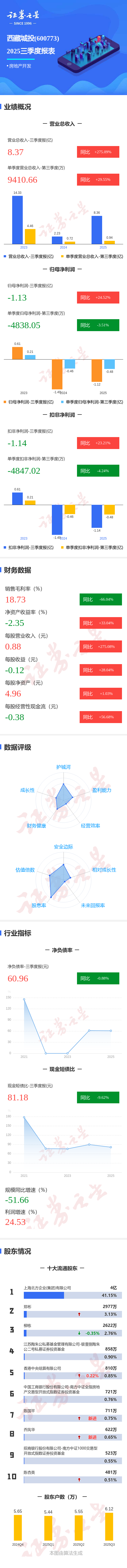 证券之星消息,西藏城投2025年三季报显示,前三季度公司主营收入8.37亿元,同比上升275.09%;归母净利润-1.13亿元,同比上升24.53%;扣非净利润-1.14亿元,同比上升23.22%;其中2025年第三季度,公司单季度主营收入9410.66万元,同比上升29.56%;单季度归母净利润-4838.05万元,同比下降3.51%;单季度扣非净利润-4847.02万元,同比下降4.24%;负债率58.23%,投资收益927.69万元,财务费用8652.99万元,毛利率18.73%。