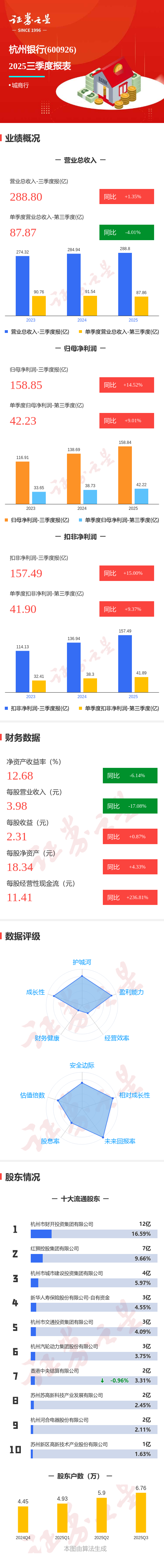证券之星消息,杭州银行2025年三季报显示,前三季度公司主营收入288.8亿元,同比上升1.35%;归母净利润158.85亿元,同比上升14.53%;扣非净利润157.49亿元,同比上升15.01%;其中2025年第三季度,公司单季度主营收入87.87亿元,同比下降4.02%;单季度归母净利润42.23亿元,同比上升9.01%;单季度扣非净利润41.9亿元,同比上升9.37%;负债率92.9%,投资收益73.07亿元。