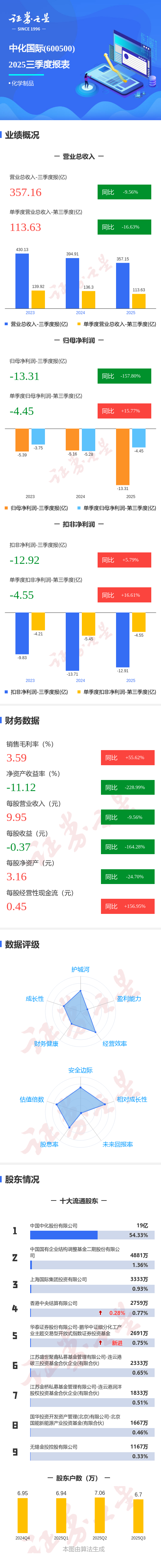 证券之星消息,中化国际2025年三季报显示,前三季度公司主营收入357.16亿元,同比下降9.56%;归母净利润-13.31亿元,同比下降157.8%;扣非净利润-12.92亿元,同比上升5.79%;其中2025年第三季度,公司单季度主营收入113.63亿元,同比下降16.63%;单季度归母净利润-4.45亿元,同比上升15.77%;单季度扣非净利润-4.55亿元,同比上升16.61%;负债率67.3%,投资收益-2.13亿元,财务费用5.03亿元,毛利率3.59%。