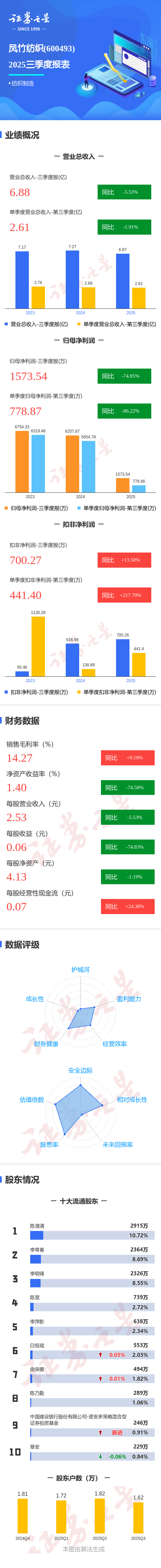 证券之星消息,凤竹纺织2025年三季报显示,前三季度公司主营收入6.88亿元,同比下降5.54%;归母净利润1573.54万元,同比下降74.86%;扣非净利润700.27万元,同比上升13.5%;其中2025年第三季度,公司单季度主营收入2.61亿元,同比下降1.91%;单季度归母净利润778.87万元,同比下降86.23%;单季度扣非净利润441.4万元,同比上升217.8%;负债率36.92%,投资收益500.54万元,财务费用-159.73万元,毛利率14.27%。