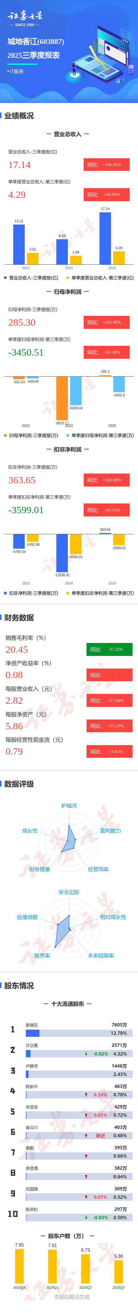 证券之星消息,城地香江2025年三季报显示,前三季度公司主营收入17.14亿元,同比上升106.96%;归母净利润285.3万元,同比上升102.97%;扣非净利润363.65万元,同比上升102.9%;其中2025年第三季度,公司单季度主营收入4.29亿元,同比上升49.6%;单季度归母净利润-3450.51万元,同比上升45.31%;单季度扣非净利润-3599.01万元,同比上升45.34%;负债率72.98%,投资收益-6.0万元,财务费用8426.47万元,毛利率20.45%。