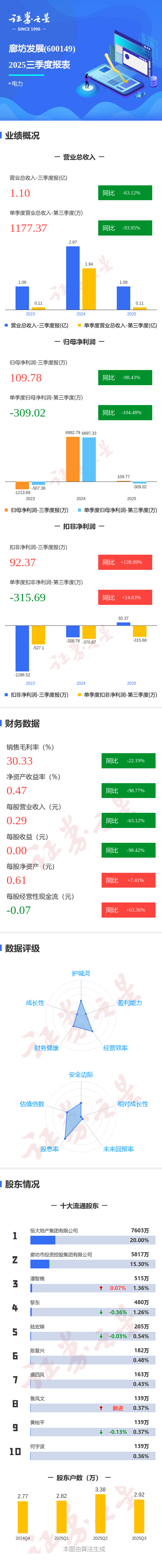 证券之星消息,廊坊发展2025年三季报显示,前三季度公司主营收入1.1亿元,同比下降63.12%;归母净利润109.78万元,同比下降98.43%;扣非净利润92.37万元,同比上升128.09%;其中2025年第三季度,公司单季度主营收入1177.37万元,同比下降93.96%;单季度归母净利润-309.02万元,同比下降104.48%;单季度扣非净利润-315.69万元,同比上升14.83%;负债率42.63%,投资收益57.69万元,财务费用30.42万元,毛利率30.33%。