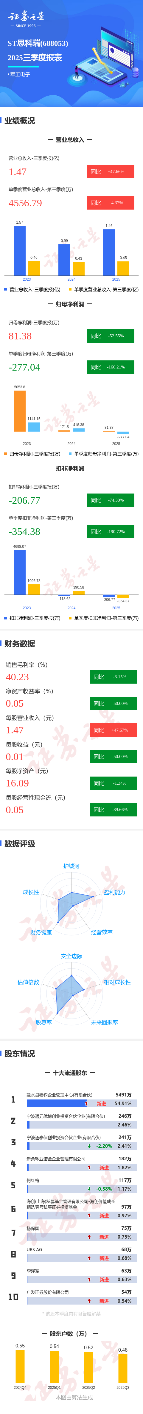 证券之星消息,ST思科瑞2025年三季报显示,前三季度公司主营收入1.47亿元,同比上升47.67%;归母净利润81.38万元,同比下降52.55%;扣非净利润-206.77万元,同比下降74.3%;其中2025年第三季度,公司单季度主营收入4556.79万元,同比上升4.37%;单季度归母净利润-277.04万元,同比下降166.22%;单季度扣非净利润-354.38万元,同比下降190.73%;负债率7.8%,投资收益741.26万元,财务费用53.94万元,毛利率40.23%。