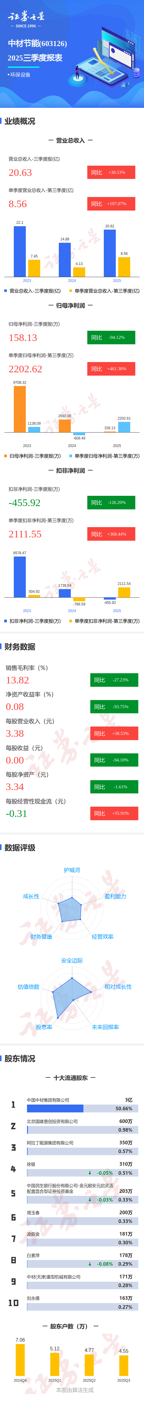 证券之星消息,中材节能2025年三季报显示,前三季度公司主营收入20.63亿元,同比上升38.54%;归母净利润158.13万元,同比下降94.13%;扣非净利润-455.92万元,同比下降126.21%;其中2025年第三季度,公司单季度主营收入8.56亿元,同比上升107.08%;单季度归母净利润2202.62万元,同比上升461.38%;单季度扣非净利润2111.55万元,同比上升368.44%;负债率55.72%,投资收益1816.11万元,财务费用-425.42万元,毛利率13.82%。