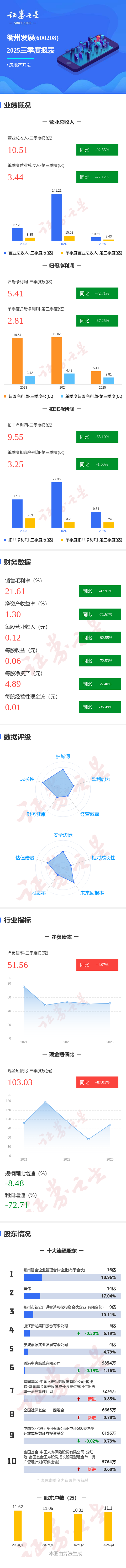证券之星消息,衢州发展2025年三季报显示,前三季度公司主营收入10.51亿元,同比下降92.56%;归母净利润5.41亿元,同比下降72.71%;扣非净利润9.55亿元,同比下降65.1%;其中2025年第三季度,公司单季度主营收入3.44亿元,同比下降77.12%;单季度归母净利润2.81亿元,同比下降37.25%;单季度扣非净利润3.25亿元,同比下降1.61%;负债率56.66%,投资收益23.74亿元,财务费用12.76亿元,毛利率21.61%。