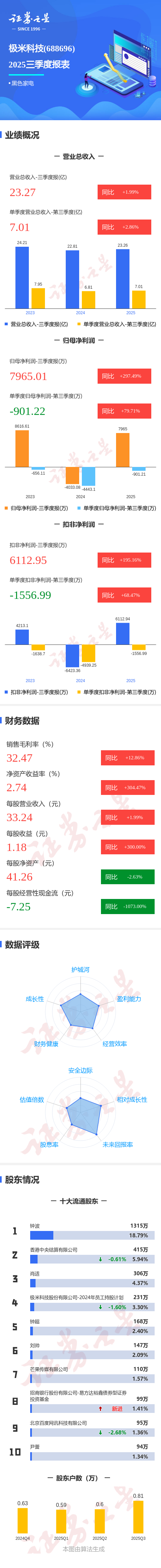 证券之星消息,极米科技2025年三季报显示,前三季度公司主营收入23.27亿元,同比上升1.99%;归母净利润7965.01万元,同比上升297.49%;扣非净利润6112.95万元,同比上升195.17%;其中2025年第三季度,公司单季度主营收入7.01亿元,同比上升2.86%;单季度归母净利润-901.22万元,同比上升79.72%;单季度扣非净利润-1556.99万元,同比上升68.48%;负债率46.83%,投资收益176.13万元,财务费用-3006.46万元,毛利率32.47%。