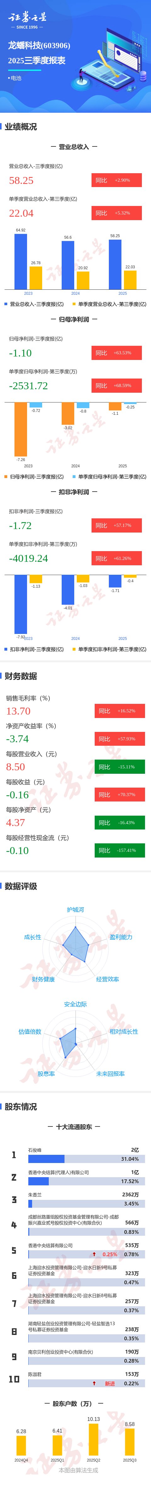 证券之星消息,龙蟠科技2025年三季报显示,前三季度公司主营收入58.25亿元,同比上升2.91%;归母净利润-1.1亿元,同比上升63.53%;扣非净利润-1.72亿元,同比上升57.18%;其中2025年第三季度,公司单季度主营收入22.04亿元,同比上升5.33%;单季度归母净利润-2531.72万元,同比上升68.6%;单季度扣非净利润-4019.24万元,同比上升61.26%;负债率79.24%,投资收益1456.91万元,财务费用1.78亿元,毛利率13.7%。