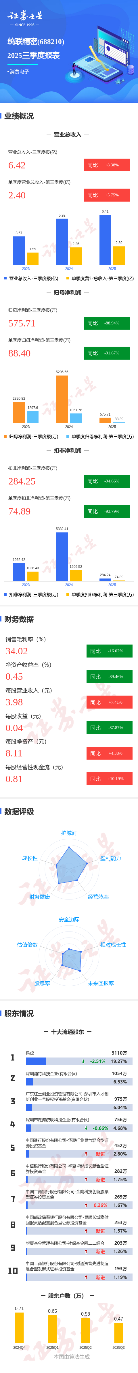 证券之星消息,统联精密2025年三季报显示,前三季度公司主营收入6.42亿元,同比上升8.38%;归母净利润575.71万元,同比下降88.94%;扣非净利润284.25万元,同比下降94.67%;其中2025年第三季度,公司单季度主营收入2.4亿元,同比上升5.75%;单季度归母净利润88.4万元,同比下降91.67%;单季度扣非净利润74.89万元,同比下降93.79%;负债率44.25%,投资收益66.38万元,财务费用996.67万元,毛利率34.02%。