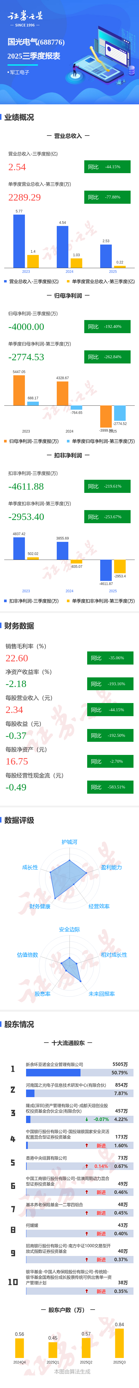 证券之星消息,国光电气2025年三季报显示,前三季度公司主营收入2.54亿元,同比下降44.16%;归母净利润-4000.0万元,同比下降192.41%;扣非净利润-4611.88万元,同比下降219.61%;其中2025年第三季度,公司单季度主营收入2289.29万元,同比下降77.88%;单季度归母净利润-2774.53万元,同比下降262.85%;单季度扣非净利润-2953.4万元,同比下降253.67%;负债率24.79%,投资收益594.32万元,财务费用-226.01万元,毛利率22.6%。
