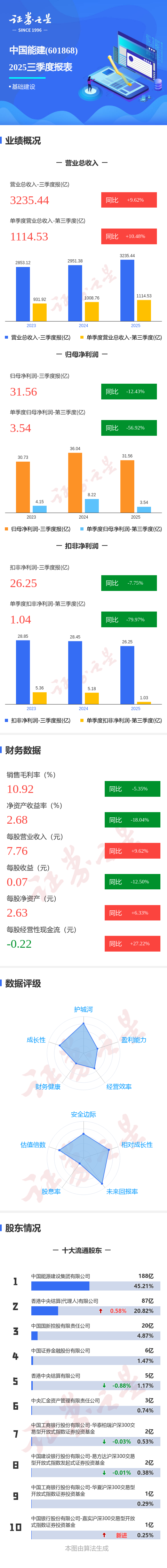 证券之星消息,中国能建2025年三季报显示,前三季度公司主营收入3235.44亿元,同比上升9.62%;归母净利润31.56亿元,同比下降12.43%;扣非净利润26.25亿元,同比下降7.76%;其中2025年第三季度,公司单季度主营收入1114.53亿元,同比上升10.48%;单季度归母净利润3.54亿元,同比下降56.92%;单季度扣非净利润1.04亿元,同比下降79.98%;负债率77.83%,投资收益1.24亿元,财务费用44.24亿元,毛利率10.92%。