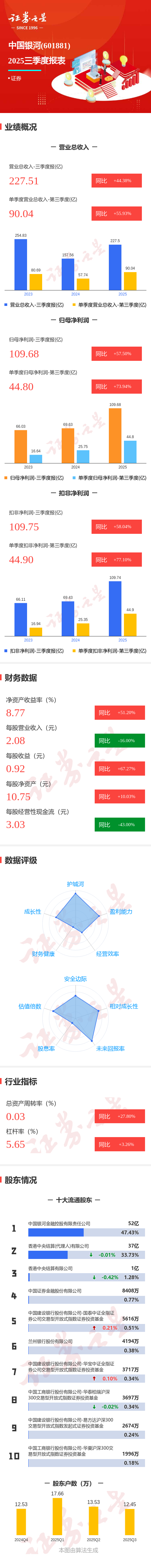 证券之星消息,中国银河2025年三季报显示,前三季度公司主营收入227.51亿元,同比上升44.39%;归母净利润109.68亿元,同比上升57.51%;扣非净利润109.75亿元,同比上升58.05%;其中2025年第三季度,公司单季度主营收入90.04亿元,同比上升55.94%;单季度归母净利润44.8亿元,同比上升73.94%;单季度扣非净利润44.9亿元,同比上升77.1%;负债率82.3%,投资收益111.49亿元。