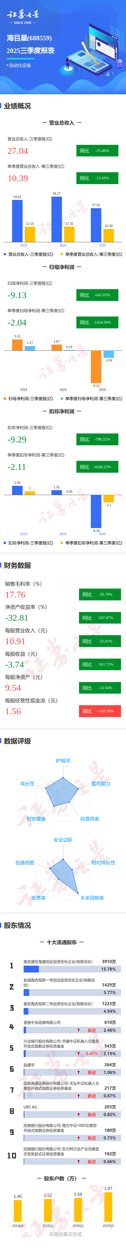 证券之星消息,海目星2025年三季报显示,前三季度公司主营收入27.04亿元,同比下降25.47%;归母净利润-9.13亿元,同比下降645.04%;扣非净利润-9.29亿元,同比下降798.32%;其中2025年第三季度,公司单季度主营收入10.39亿元,同比下降15.69%;单季度归母净利润-2.04亿元,同比下降1434.91%;单季度扣非净利润-2.11亿元,同比下降4288.23%;负债率82.36%,投资收益1035.31万元,财务费用4011.04万元,毛利率17.76%。