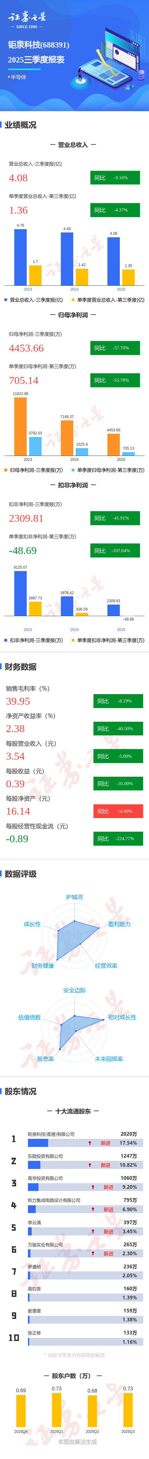 证券之星消息,钜泉科技2025年三季报显示,前三季度公司主营收入4.08亿元,同比下降9.17%;归母净利润4453.66万元,同比下降37.71%;扣非净利润2309.81万元,同比下降41.91%;其中2025年第三季度,公司单季度主营收入1.36亿元,同比下降4.38%;单季度归母净利润705.14万元,同比下降53.79%;单季度扣非净利润-48.69万元,同比下降107.65%;负债率5.83%,投资收益2346.63万元,财务费用-81.45万元,毛利率39.95%。