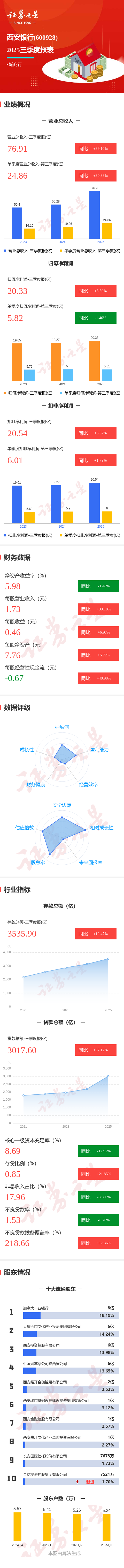 证券之星消息,西安银行2025年三季报显示,前三季度公司主营收入76.91亿元,同比上升39.11%;归母净利润20.33亿元,同比上升5.51%;扣非净利润20.54亿元,同比上升6.58%;其中2025年第三季度,公司单季度主营收入24.86亿元,同比上升30.39%;单季度归母净利润5.82亿元,同比下降1.47%;单季度扣非净利润6.01亿元,同比上升1.8%;负债率92.82%,投资收益10.89亿元。