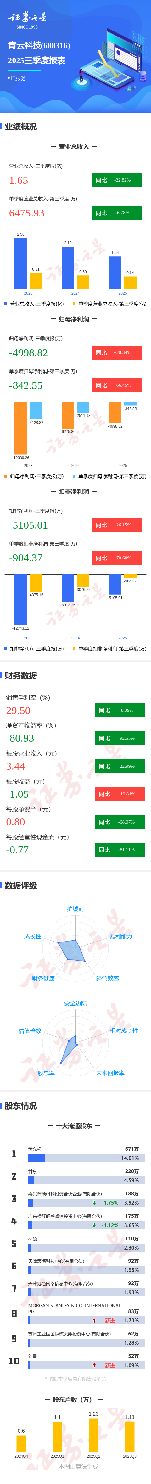 证券之星消息,青云科技2025年三季报显示,前三季度公司主营收入1.65亿元,同比下降22.83%;归母净利润-4998.82万元,同比上升20.35%;扣非净利润-5105.01万元,同比上升26.16%;其中2025年第三季度,公司单季度主营收入6475.93万元,同比下降6.79%;单季度归母净利润-842.55万元,同比上升66.46%;单季度扣非净利润-904.37万元,同比上升70.61%;负债率86.83%,投资收益37.28万元,财务费用795.11万元,毛利率29.5%。