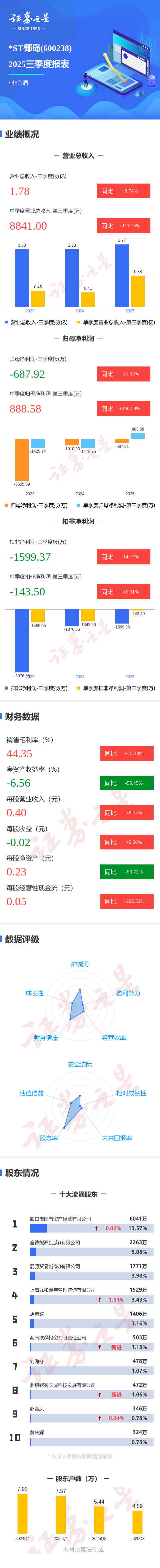证券之星消息,*ST椰岛2025年三季报显示,前三季度公司主营收入1.78亿元,同比上升8.75%;归母净利润-687.92万元,同比上升31.95%;扣非净利润-1599.37万元,同比上升14.77%;其中2025年第三季度,公司单季度主营收入8841.0万元,同比上升111.74%;单季度归母净利润888.58万元,同比上升160.29%;单季度扣非净利润-143.5万元,同比上升89.32%;负债率85.19%,投资收益-166.72万元,财务费用1201.51万元,毛利率44.35%。