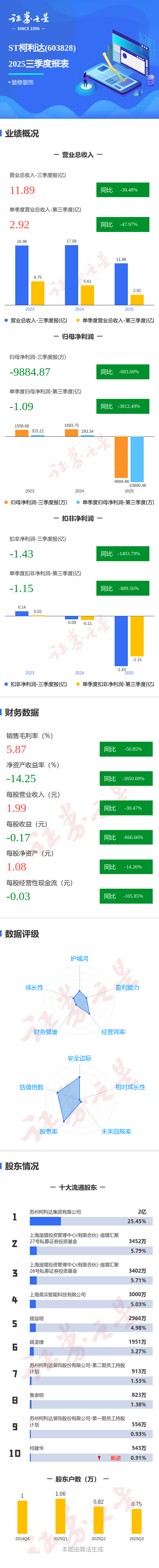证券之星消息,ST柯利达2025年三季报显示,前三季度公司主营收入11.89亿元,同比下降30.48%;归母净利润-9884.87万元,同比下降683.61%;扣非净利润-1.43亿元,同比下降1403.79%;其中2025年第三季度,公司单季度主营收入2.92亿元,同比下降47.97%;单季度归母净利润-1.09亿元,同比下降3812.49%;单季度扣非净利润-1.15亿元,同比下降889.56%;负债率83.32%,投资收益137.39万元,财务费用4313.43万元,毛利率5.87%。