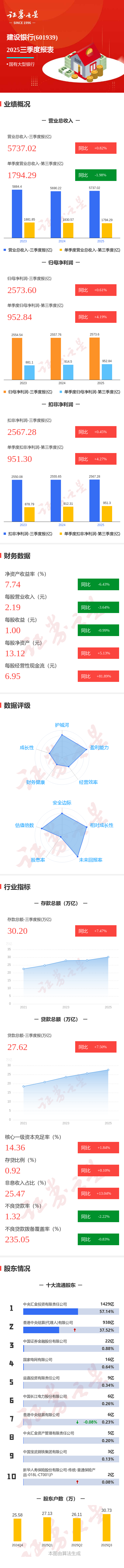 证券之星消息,建设银行2025年三季报显示,前三季度公司主营收入5737.02亿元,同比上升0.82%;归母净利润2573.6亿元,同比上升0.62%;扣非净利润2567.28亿元,同比上升0.46%;其中2025年第三季度,公司单季度主营收入1794.29亿元,同比下降1.98%;单季度归母净利润952.84亿元,同比上升4.19%;单季度扣非净利润951.3亿元,同比上升4.27%;负债率91.94%,投资收益367.61亿元。