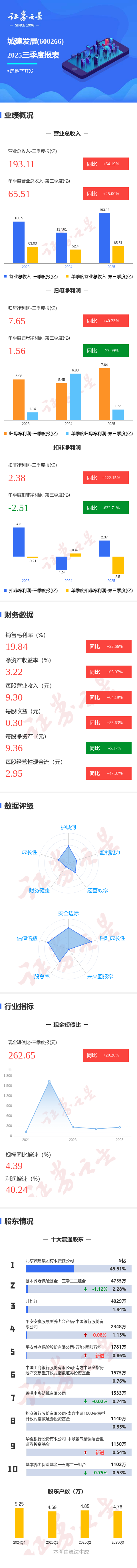 证券之星消息,城建发展2025年三季报显示,前三季度公司主营收入193.11亿元,同比上升64.2%;归母净利润7.65亿元,同比上升40.24%;扣非净利润2.38亿元,同比上升222.16%;其中2025年第三季度,公司单季度主营收入65.51亿元,同比上升25.01%;单季度归母净利润1.56亿元,同比下降77.09%;单季度扣非净利润-2.51亿元,同比下降632.72%;负债率76.88%,投资收益4.23亿元,财务费用3.07亿元,毛利率19.84%。