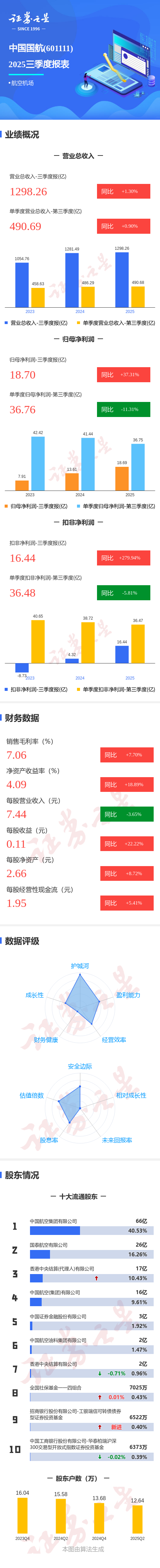 证券之星消息,中国国航2025年三季报显示,前三季度公司主营收入1298.26亿元,同比上升1.31%;归母净利润18.7亿元,同比上升37.31%;扣非净利润16.44亿元,同比上升279.95%;其中2025年第三季度,公司单季度主营收入490.69亿元,同比上升0.9%;单季度归母净利润36.76亿元,同比下降11.31%;单季度扣非净利润36.48亿元,同比下降5.82%;负债率87.88%,投资收益22.3亿元,财务费用37.71亿元,毛利率7.06%。