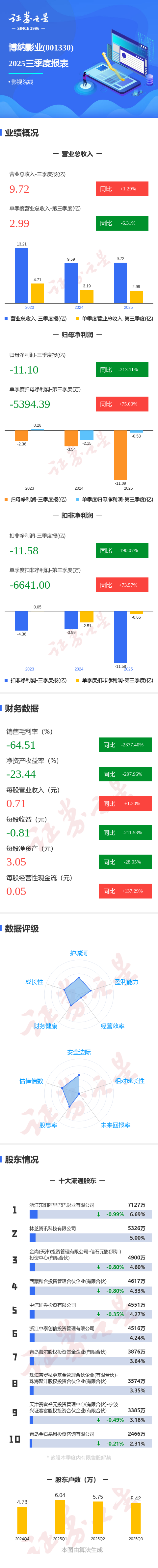 证券之星消息,博纳影业2025年三季报显示,前三季度公司主营收入9.72亿元,同比上升1.29%;归母净利润-11.1亿元,同比下降213.11%;扣非净利润-11.58亿元,同比下降190.08%;其中2025年第三季度,公司单季度主营收入2.99亿元,同比下降6.31%;单季度归母净利润-5394.39万元,同比上升75.0%;单季度扣非净利润-6641.0万元,同比上升73.57%;负债率65.03%,投资收益554.12万元,财务费用1.45亿元,毛利率-64.51%。