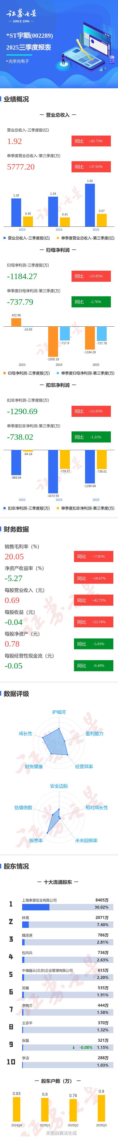 证券之星消息,*ST宇顺2025年三季报显示,前三季度公司主营收入1.92亿元,同比上升42.73%;归母净利润-1184.27万元,同比上升23.85%;扣非净利润-1290.69万元,同比上升22.83%;其中2025年第三季度,公司单季度主营收入5777.2万元,同比上升37.94%;单季度归母净利润-737.79万元,同比下降2.77%;单季度扣非净利润-738.02万元,同比下降1.21%;负债率45.77%,财务费用229.51万元,毛利率20.05%。