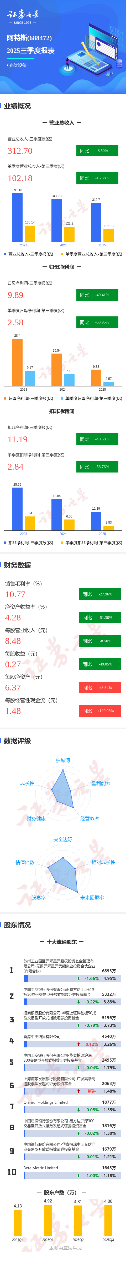 证券之星消息,阿特斯2025年三季报显示,前三季度公司主营收入312.7亿元,同比下降8.51%;归母净利润9.89亿元,同比下降49.41%;扣非净利润11.19亿元,同比下降40.59%;其中2025年第三季度,公司单季度主营收入102.18亿元,同比下降16.38%;单季度归母净利润2.58亿元,同比下降63.96%;单季度扣非净利润2.84亿元,同比下降56.77%;负债率65.96%,投资收益-1.46亿元,财务费用9796.06万元,毛利率10.77%。