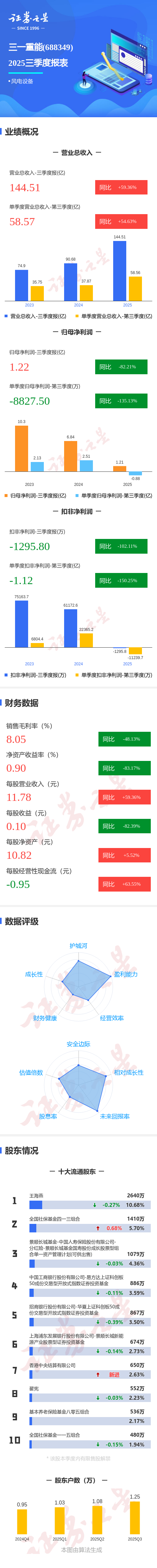 证券之星消息,三一重能2025年三季报显示,前三季度公司主营收入144.51亿元,同比上升59.36%;归母净利润1.22亿元,同比下降82.21%;扣非净利润-1295.8万元,同比下降102.12%;其中2025年第三季度,公司单季度主营收入58.57亿元,同比上升54.64%;单季度归母净利润-8827.5万元,同比下降135.13%;单季度扣非净利润-1.12亿元,同比下降150.26%;负债率70.64%,投资收益1.98亿元,财务费用-1919.7万元,毛利率8.05%。
