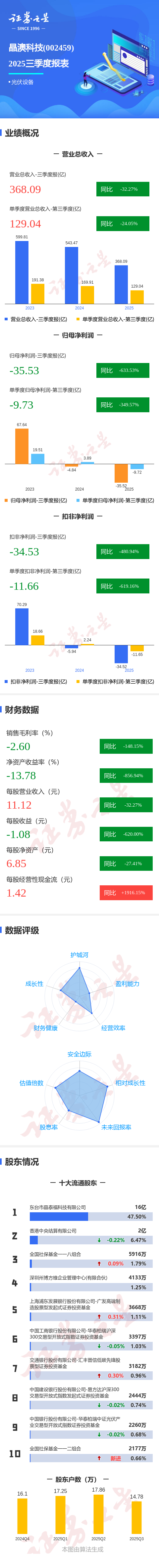 证券之星消息,晶澳科技2025年三季报显示,前三季度公司主营收入368.09亿元,同比下降32.27%;归母净利润-35.53亿元,同比下降633.54%;扣非净利润-34.53亿元,同比下降480.95%;其中2025年第三季度,公司单季度主营收入129.04亿元,同比下降24.05%;单季度归母净利润-9.73亿元,同比下降349.58%;单季度扣非净利润-11.66亿元,同比下降619.16%;负债率77.9%,投资收益-2.0亿元,财务费用3923.06万元,毛利率-2.6%。