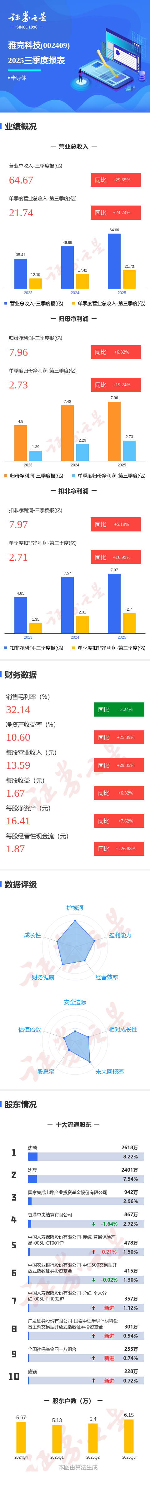 证券之星消息,雅克科技2025年三季报显示,前三季度公司主营收入64.67亿元,同比上升29.36%;归母净利润7.96亿元,同比上升6.33%;扣非净利润7.97亿元,同比上升5.19%;其中2025年第三季度,公司单季度主营收入21.74亿元,同比上升24.75%;单季度归母净利润2.73亿元,同比上升19.24%;单季度扣非净利润2.71亿元,同比上升16.95%;负债率40.42%,投资收益108.19万元,财务费用8558.92万元,毛利率32.14%。