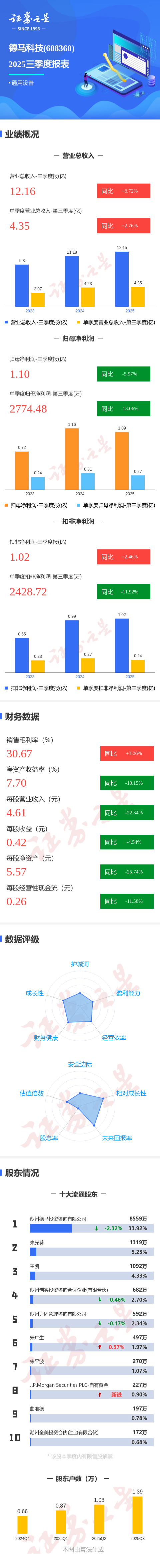 证券之星消息,德马科技2025年三季报显示,前三季度公司主营收入12.16亿元,同比上升8.72%;归母净利润1.1亿元,同比下降5.98%;扣非净利润1.02亿元,同比上升2.47%;其中2025年第三季度,公司单季度主营收入4.35亿元,同比上升2.77%;单季度归母净利润2774.48万元,同比下降13.07%;单季度扣非净利润2428.72万元,同比下降11.92%;负债率57.27%,投资收益48.22万元,财务费用727.74万元,毛利率30.67%。