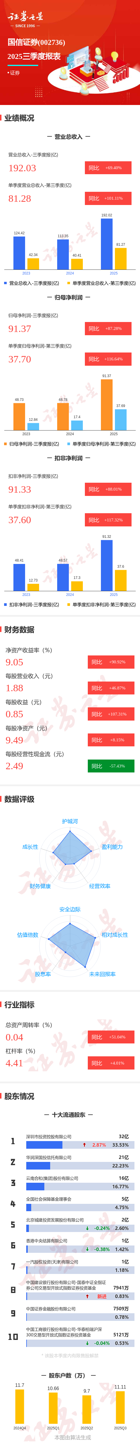 证券之星消息,国信证券2025年三季报显示,前三季度公司主营收入192.03亿元,同比上升69.41%;归母净利润91.37亿元,同比上升87.28%;扣非净利润91.33亿元,同比上升88.02%;其中2025年第三季度,公司单季度主营收入81.28亿元,同比上升101.11%;单季度归母净利润37.7亿元,同比上升116.65%;单季度扣非净利润37.6亿元,同比上升117.33%;负债率77.3%,投资收益82.0亿元。